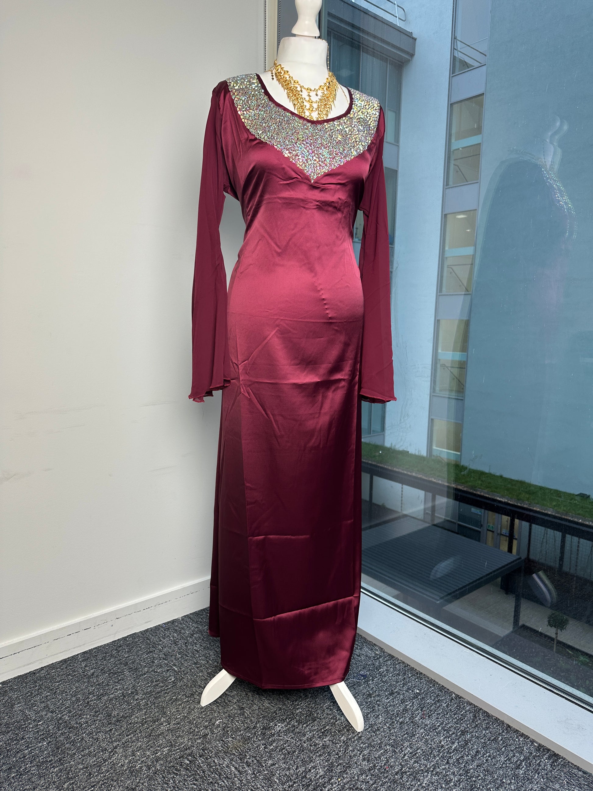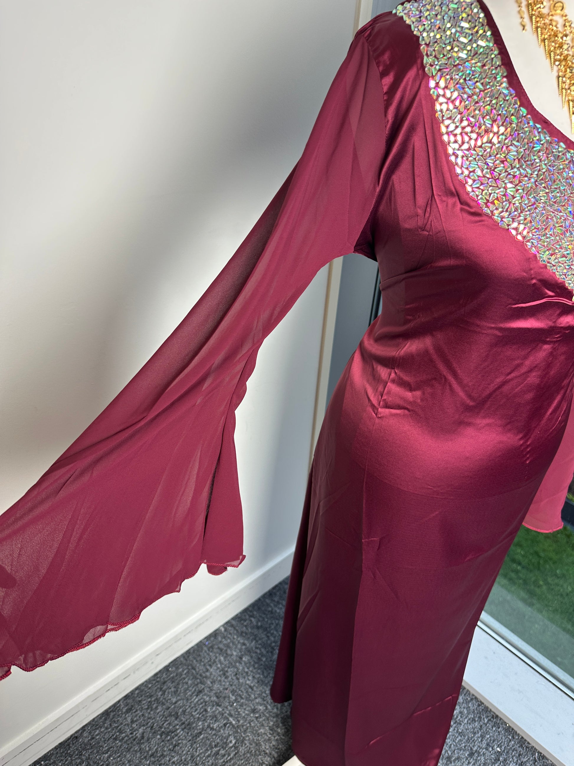 Ruby red low cut silk dress with chiffon sleeves with pockets