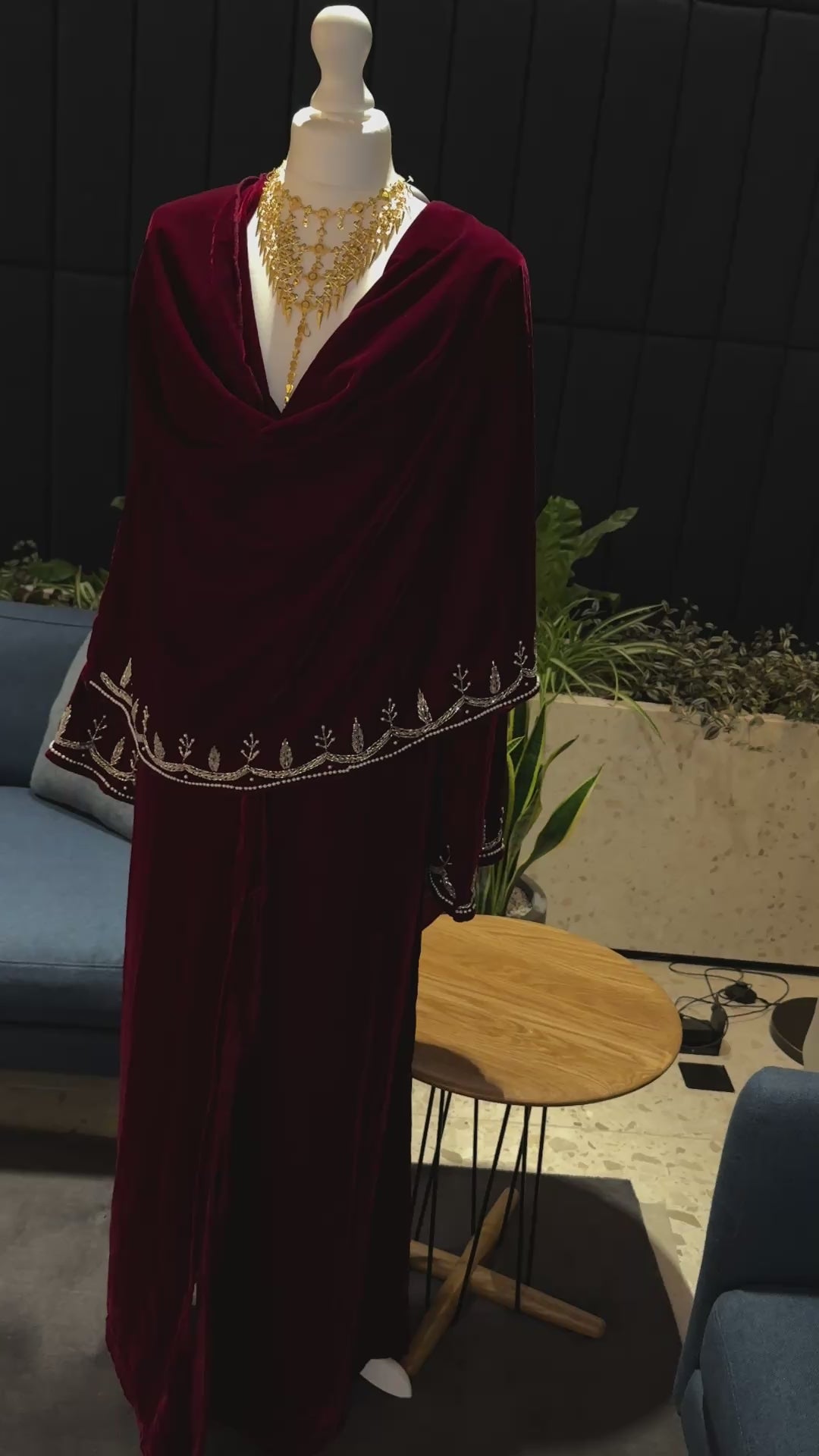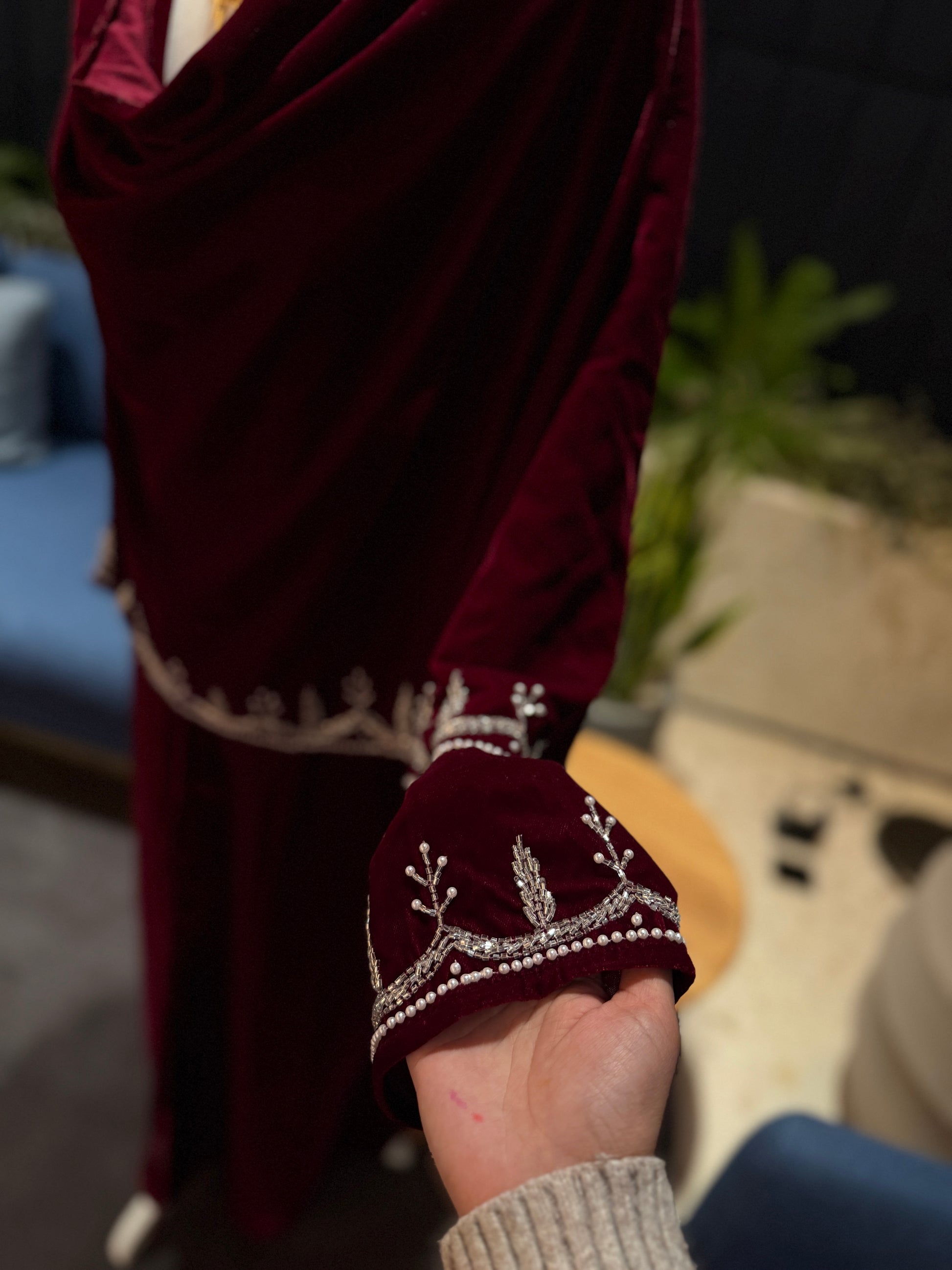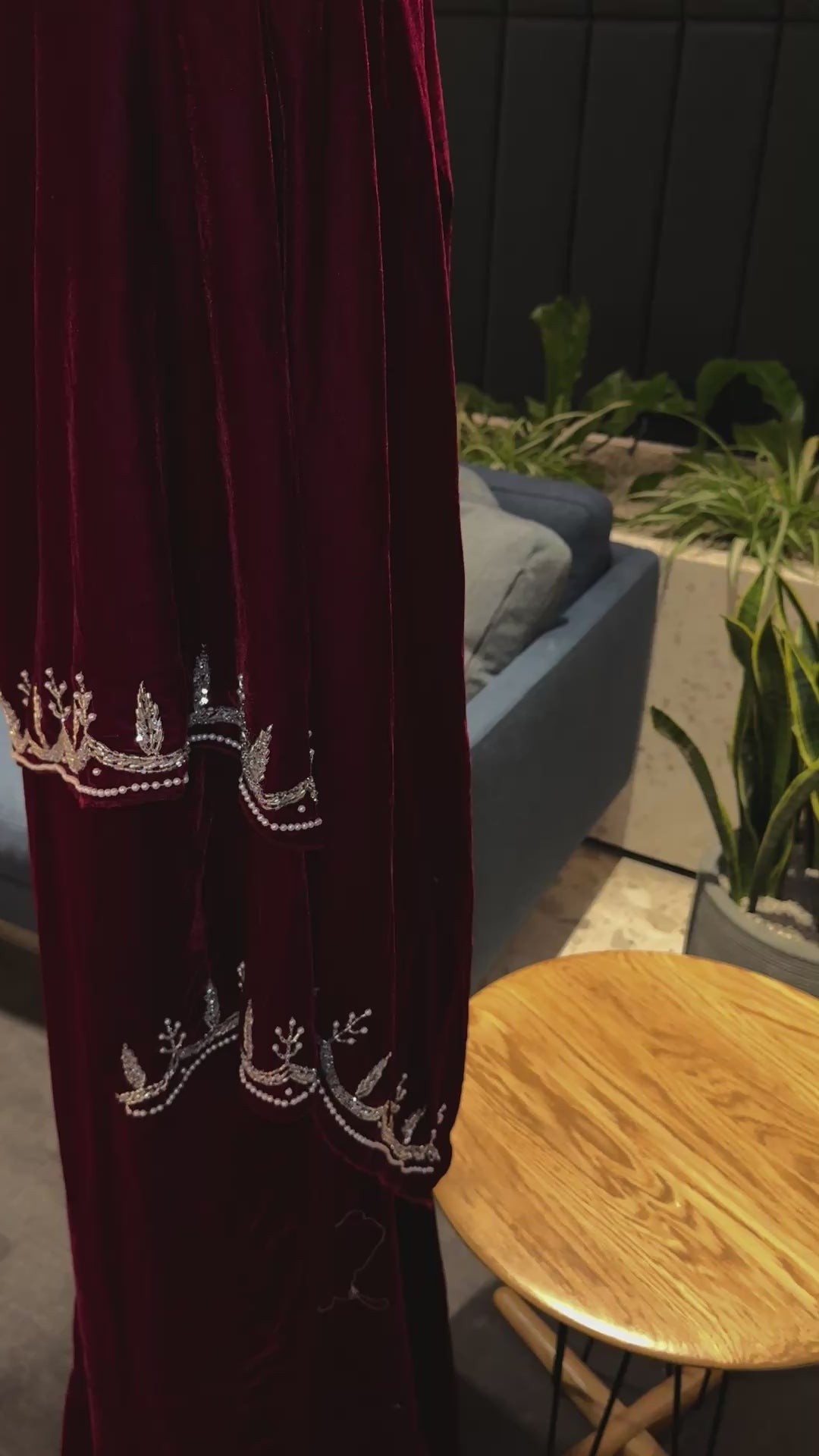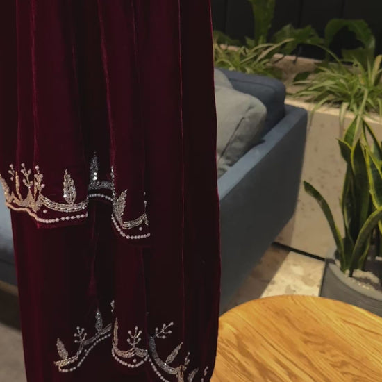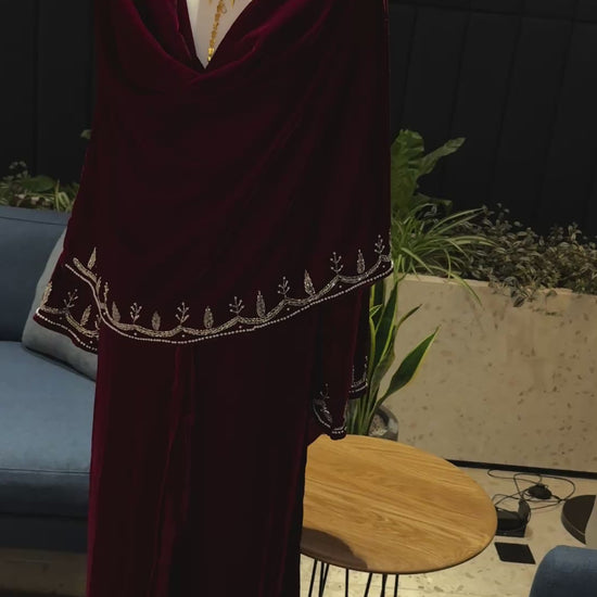 Burgundy Velvet abaya with scarf and handmade work